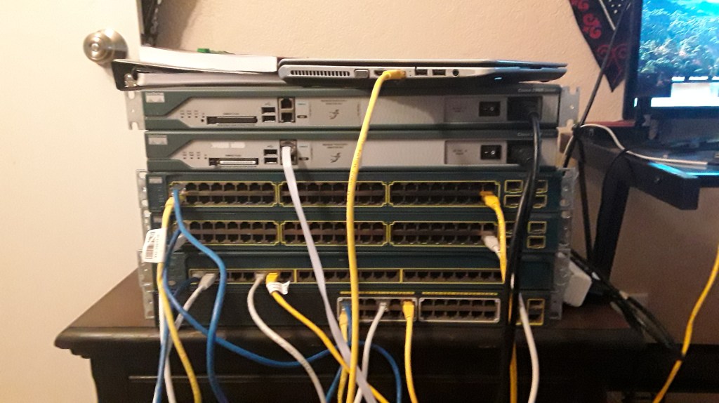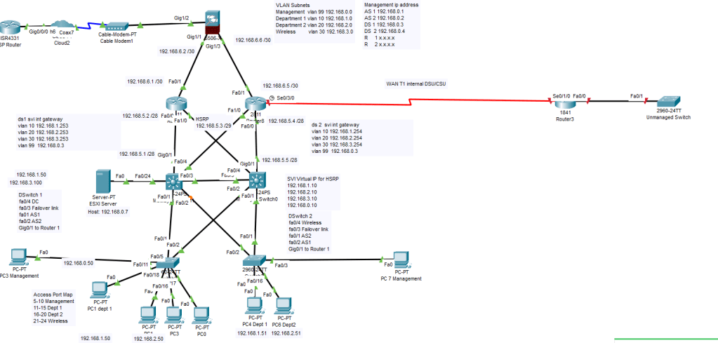 10/20/2020 – Progress on lab network. So far DHCP has been setup in the packet tracer lab. I’ll be attempting to replicate the network below into actual hardware. The serial link hasn’t been setup yet and the firewall hasn’t been connected to the internet/cable modem yet. The packet tracer lab is different from the physical network so there will need to be some adjustments made to the configurations.